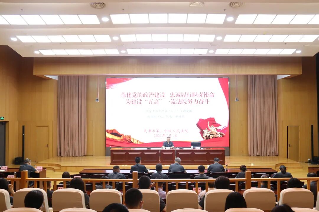 为庆祝中国共产党建党101周年,深入学习宣传贯彻市第十二次党代会精神,推动主题学习宣传教育实践活动走深走实,7月1日下午,院党组书记、院长郝树龙以“强化党的政治建设,忠诚履行职责使命,为建设‘五高’一流法院努力奋斗”为题,为全院干警讲授专题党课。会议由院党组成员、政治部主任闻福双主持,全院干警参加。