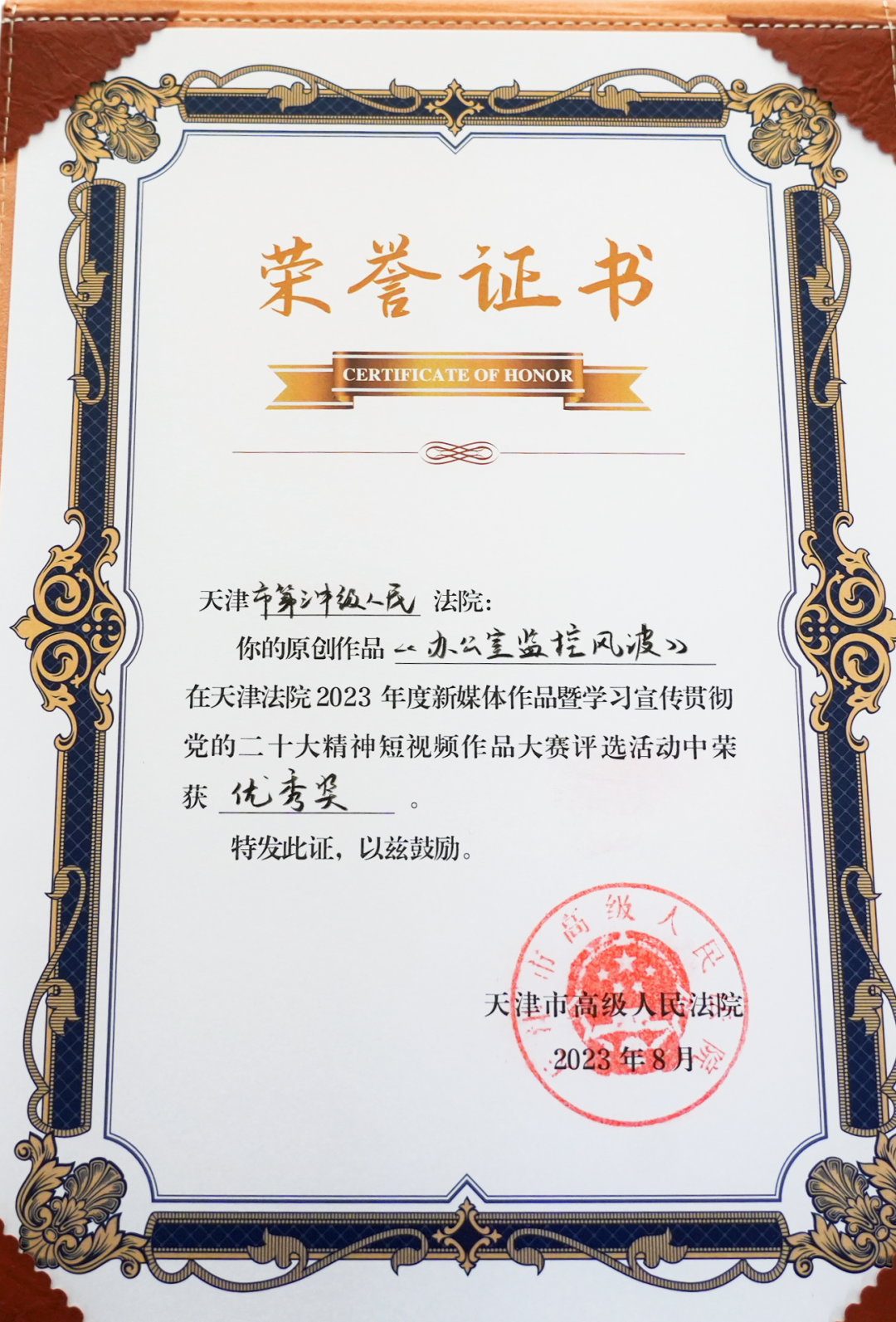 近日,市高院法制宣传处组织开展了“天津法院2023年度新媒体作品暨学习宣传贯彻党的二十大精神短视频作品大赛”。比赛共收到短视频作品63部,内容涵盖通过案例精准普法、展示法院法官形象、反映司法审判日常工作等方面。市高院组织各院评审代表对初评进入网上投票环节的29部作品进行了线下评分,并按照活动确定的计分规则计算得出最终结果。三中院原创短视频《办公室监控风波》获评“优秀奖”和“最佳人气奖”。
